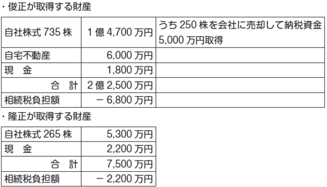 そのため、隆正の遺留分相当割合と両名の相続税の納税まで考慮すると、隆正にも自社株式の相当割合を相続させ、かつ納税資金のために俊正が取得した株式の一部を会社に売却するしかないということとなり、将来の財産承継案を検討した結果、俊正の占める議決権比率が3分の2を割ってしまう見込みとなってしまいました(図表2~5)。