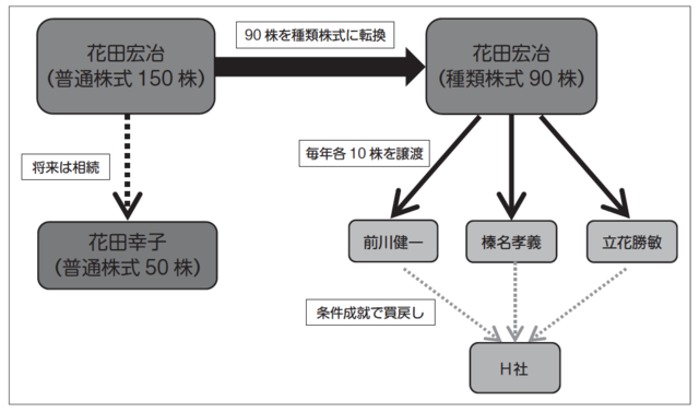 株式については、創業時は花田宏冶と妻とで各100株を所有していましたが、妻が死亡した際に50株が娘の幸子に相続され、現在の株主は花田宏冶(150株)と花田幸子(50株)となっており、1株の時価は100万円と評価されています。