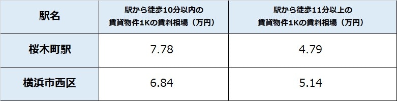 駅周辺の家賃水準をみていきましょう。駅から徒歩10分圏内の1Kの平均家賃は7.78万円、11分を超えると4.79万円(図表1)。同条件の横浜市中区の家賃水準は、駅10分圏内で6.84万円、11分超えで5.14万円。「桜木町」駅周辺の家賃水準は、駅チカでは区の平均値を大きく超えますが、駅から離れると古い街並みが広がるエリアが主体となるため、家賃水準は同区平均を下回る傾向にあります。