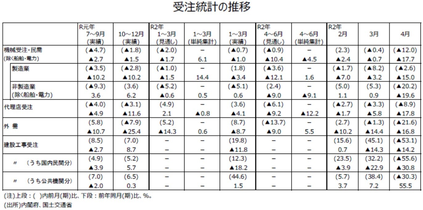4月分機械受注(除船電民需)はコロナ禍で前月比▲12.0%の大幅減