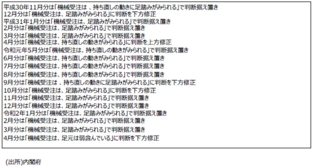 ●内閣府の基調判断の推移をみると、19年9月分では「機械受注は、持ち直しの動きに足踏みがみられる」という判断に下方修正された。その後10月分ではさらに下方修正され、18年12月分~19年3月分以来の「機械受注は、足踏みがみられる」という判断になった。11月分・12月分・20年1月分、2月分、3月分と、「機械受注は、足踏みがみられる」という判断であったが、新型コロナウイルス感染拡大の影響が大きく出た4月分では「機械受注は、足元は弱含んでいる」という判断に下方修正された。