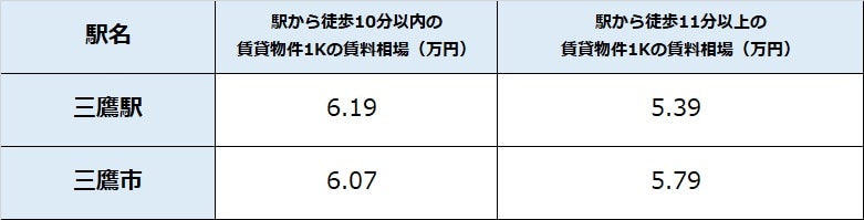 駅周辺の家賃水準をみていきましょう。駅から徒歩10分圏内の1Kの平均家賃は6.19万円、11分を超えると5.39万円(図表1)。同条件の東京都三鷹市の家賃水準は、駅10分圏内で6.07万円、11分を超えると5.79万円。駅から近いエリアは、三鷹市の家賃水準を少々上回っています。