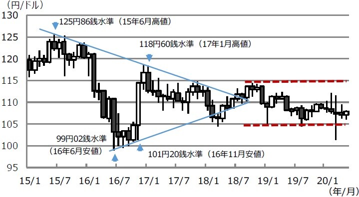 さて、ここでドル円について、少し時間をさかのぼってその動きを確認してみます。ドル円は、2016年6月安値と11月安値を結んだ下値支持線と、2015年6月高値と2017年1月高値を結んだ上値抵抗線によって、三角保ち合い(もちあい)を形成していました(図表2)。しかしながら、2018年夏頃までに、いずれの線も明確に抜けることなく、三角保ち合いは消滅しました。その後、ドル円はおおむね105円から115円の間で推移しています。