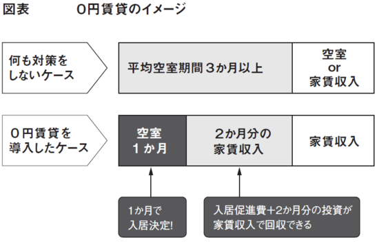 明確に線引きするならば、1部屋でも空きがあり、その空室期間が平均で3か月以上あるような物件です。一度部屋が開くと1か月で決まるケースは少なく、最低でも2か月以上は空室が続くといわれています。0円賃貸は平均1か月で入居が決まりますから、平均で3か月以上空いているのであれば、入居促進費のプラス2か月分の投資がその時点で回収できる計算になります。(下記図表参照)