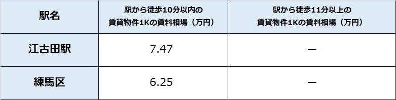駅周辺の家賃水準をみていきましょう。駅から徒歩10分圏内の1Kの平均家賃は7.47円(図表1)。同条件の練馬区の家賃水準は、駅10分圏内で6.25万円。「江古田」駅周辺は複数路線が使えるという立地から、区平均よりも高い家賃水準となっています。