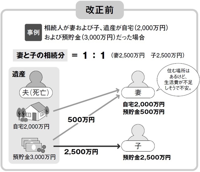 ところが、夫が残した財産が2,000万円の自宅と3,000万円の預貯金だった場合、妻は住む場所として自宅を相続したいのに、取り分が1/2だと預貯金は500万円しか相続することができず、生活費が不足するという問題が生じていたのです。