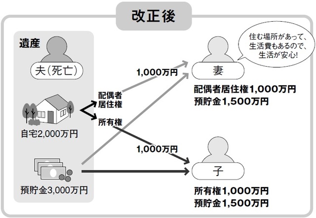 自宅の2,000万円の価値を、1,000万円の所有権と1,000万円の配偶者居住権とに分けて、子どもが所有権の1,000万円を、妻が居住権の1,000万円をそれぞれ相続することにより、妻はこれまでよりも1,000万円多い1,500万円の預貯金を相続することができ、安心して生活できるようになるというわけです。この制度は2020年4月1日からスタートします。