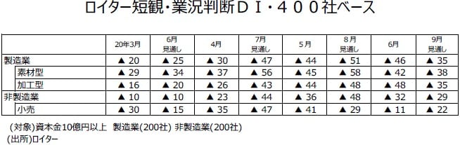 ●6月17日に発表されたロイター短観6月調査の調査期間は6月2日から6月12日である。6月調査400社ベースの製造業DIは3月調査の▲20から26ポイント悪化し▲46となった。一方、200社ベースの製造業の業況判断DIは3月調査の▲25から30ポイント悪化し▲55となった。