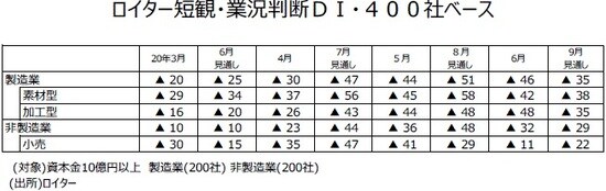 ●一方、ロイター短観6月調査の9月までの「先行き見通し」は、製造業・400社ベースで▲35と6月実績の▲46から11ポイント改善の見込み、製造業・200社ベースで▲46と6月実績の▲55から9ポイント改善の見込み、非製造業・400社ベースの9月までの「先行き見通し」は▲29と、6月実績の▲32から3ポイント改善の見込み、非製造業・200社ベースの9月までの「先行き見通し」は▲35と、こちらは6月実績の▲33から2ポイント悪化予想である。