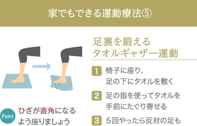 足の裏は、全身のバランスを保つ部位なので、足裏の筋肉が衰えると、ひざ関節にも代償となる動作が加わり、負担が増えてしまいます。足の指を動かして鍛えるようにしましょう。
