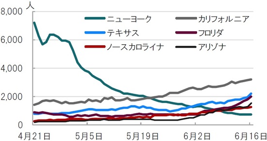 一方、ニューヨーク州は新規感染者が減少傾向です。図表では比較のために含めました。先の足元で新規感染者数が増加している州は経済活動の再開に比較的意欲的であったと見られます。おおむね4月末から5月初めに経済活動再開に向け舵を切る動きが見られました。たとえば、カリフォルニアは5月8日から地域別に経済活動を再開させています。テキサス州は新規感染者数が拡大していた5月1日に段階的な解除に踏み出しています。また、フロリダでは5月4日には一部の地域で、第1ステップの回復計画として制限的ながら飲食店なども再開されました。