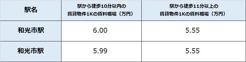 駅周辺の家賃水準をみていきましょう。駅から徒歩10分圏内の1Kの平均家賃は6.00万円、11分を超えると5.55万円(図表1)。同条件の横須賀市の家賃水準は、駅10分圏内で5.99万円、11分を超えると5.55万円。「和光市」駅周辺は、和光市の平均と、ほぼ同程度の家賃水準です。