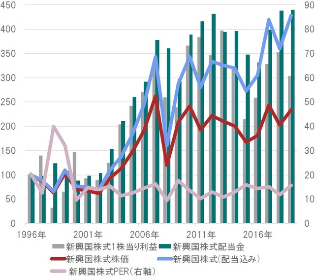 ※1996年12月末を100として指数化。米ドルベース。新興国株式:MSCIエマージング・マーケット指数。