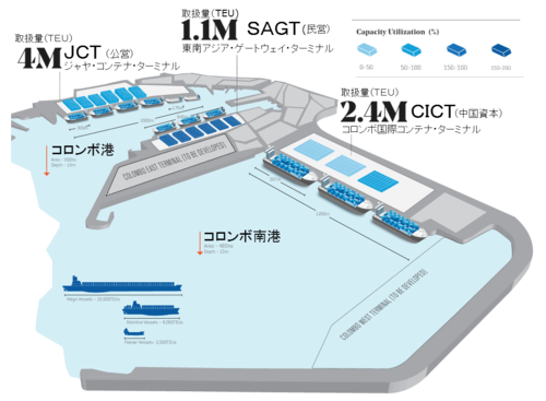 一方で「ジャヤ・コンテナ・ターミナル(JCT)」と「東南アジア・ゲートウェイ・ターミナル(SAGT)」がある以前からのコロンボ港の水深は15メートルだ。この深さでは巨大コンテナ船を受け入れることができない。2015年にCICTが取り扱った160万TEUのうち、67%は巨大コンテナ船によって運ばれてきたものである。そして残りの33%はJCTとSAGTからCICTにターミナル変更をした分だった。