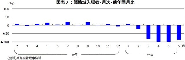 新型コロナウイルス感染症の影響で、5月分の訪日外客数は1,700人と史上最低となった。前年同月比は▲99.9%である。インバウンド消費が減少し5月分の外国人観光客百貨店売上高・前年同月比は▲97.5%だった。5月分の観光地の人出は激減した。休園していた金沢兼六園や函館五稜郭タワー入場者はゼロ人で前年同月比▲100%だった。6月分では金沢兼六園の入場者は前年同月比▲87.5%、函館五稜郭タワー入場者は前年同月比▲93.6%とまだまだ厳しい状況ながら幾分マイナス幅が縮小した。姫路城は5月28日から敷地内入場を再開、6月15日から天守閣入場再開したという。5月分の入場者は前年同月比が▲99.3%だったが、6月分では▲86.0%になった(図表7)。