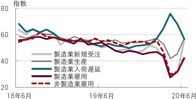 たとえば、コロナの感染再拡大を懸念する声もあります。またISMによると回答の多くは米国の感染再拡大により経済活動の一部制限が再び実施される前に送られたという点に注意は必要です。構成指数では、雇用は製造業、非製造業ともに、改善はしていますが水準は低くなっています。経済活動再開を受け、6月の雇用統計でも短期的な雇用者数の増加は見られました。しかし縮小した米国雇用市場がコロナ以前に戻る、本格的な回復には時間がかかるように思われます。