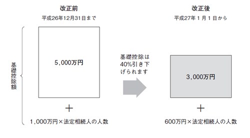 たとえば、5,000万円の財産(相続税評価額)を子ども1人で相続するとしましょう。平成26年まででしたら、基礎控除額は5,000万円+1,000万円×1人(法定相続人の数)=6,000万円ですから、相続財産は基礎控除額以内であるため相続税は課されません。しかし、税制改正後は、基礎控除額が3,000万円+600万円×1人=3,600万円になるため、基礎控除額を超える1,400万円に対して相続税160万円が課されることとなります。