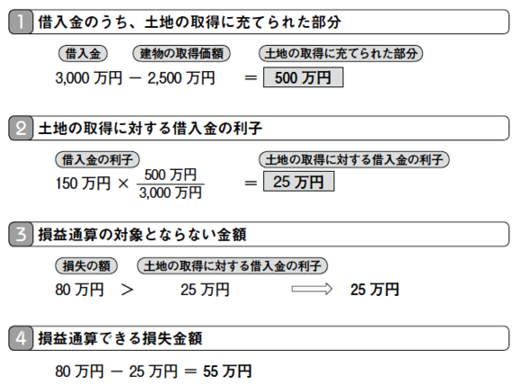 A.不動産所得の損失のうち、土地の取得に要した借入金の利子の額からなる部分は、他の所得と通算することができません。しかし、通常、このマンションのように、借入金が土地と建物のどちらに対するものか区分できません。