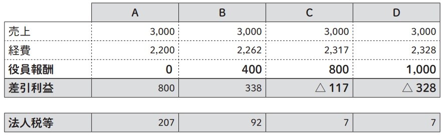 この状態で役員報酬の金額につきA~Dのように4パターンを設定して、シミュレーションを行った。