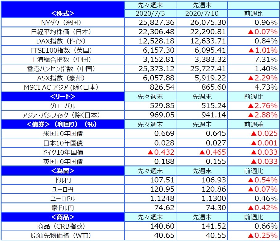 主要株式市場はまちまちの動きとなりました。米国株式市場は、新型コロナウイルス感染拡大が続いたものの、経済指標の改善や、ワクチンや治療薬の開発期待などが支援材料となりました。また主力ハイテク株の堅調が続いたことも上昇に寄与しました。NYダウは週間では0.96%上昇しました。日本株式市場は、週初は米国での主力ハイテク株の堅調などを好感して上昇して始まりましたが、東京などで新型コロナウイルスの新規感染者が増加したことなどを受けて下落しました。日経平均株価は週間ではほぼ横ばいとなりました。欧州株式市場は、高安まちまちとなり、DAX指数は0.84%上昇、FTSE100は1.01%下落しました。中国株式市場は、予想より強い経済指標の発表が相次いだことや、4-6月期GDPがプラス成長を回復するとの期待などから景況感が大きく改善し上海総合指数は7.31%の大幅上昇となりました。香港ハンセン指数は香港国家安全法への不透明感などから1.40%の上昇にとどまりました。
