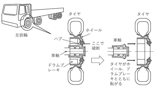 2002年1月、横浜市瀬谷区で、三菱自動車工業のトレーラー型トラックのタイヤ(直径1 m、質量140kg)が外れて、約50m離れた歩道を歩いていた母子3人を直撃し、母親が死亡しました。その原因は[図表2]に示すように、タイヤと車軸をつなぐハブの強度不足により、ハブの付け根にき裂が発生して破断したためです。