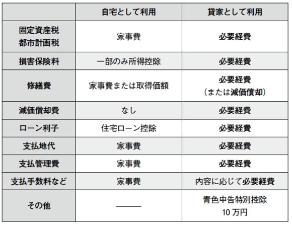 下記図表は、自宅として利用した場合と、貸家として利用した場合にかかる経費の比較です。