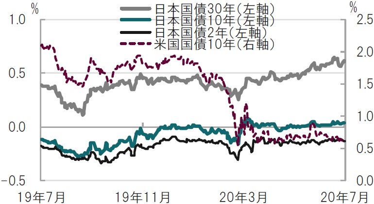 YCCは市場の価格発見機能と相性がよくありません。コロナ前、米国と日本の10年国債利回りは似たような動きをしていました(図表参照)。コロナを受け、米国国債利回りは急低下しましたが、YCC下の日本国債利回りの変動は限定的でした。日本が利下げをしていないことや、YCCが機能していると言ってしまえばそれまでですが、不自然な印象も残ります。YCCの維持には、効果とコストの検証がいっそう求められるように思われます。