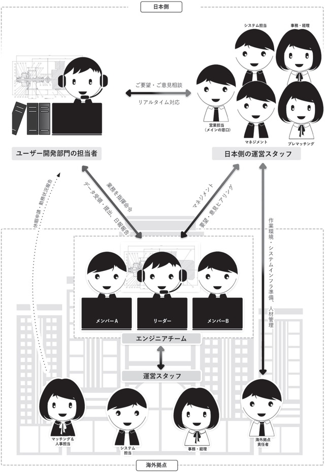 要するに、日本のエンジニアの手足が増えたような状態を生み出すことが可能になるわけです。海外の開発ルームに入るエンジニアたちは、毎朝現地時間の定時に出勤してパソコンの前に座ります。彼らは日本の開発室が擁する「専用チーム」です。