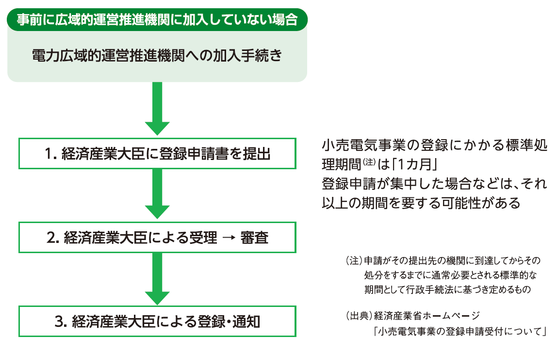 小売電気事業者の登録申請に当たっては、事前に電力広域的運営推進機関(広域機関)への加入手続きが必要です。広域機関はすべての電気事業者に加入義務があり、小売電気事業者の登録申請には「広域的運営推進機関に加入する手続きをとったことを証する書類」を添付する必要があります。