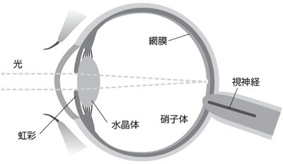 こうして外から入ってきた光は水晶体を通ったあとに屈折し、網膜上に像を結びます。網膜はフィルムのような役割を果たしているといえます。