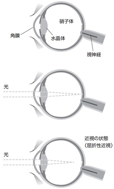 カメラのレンズは分厚くなったり薄く伸びたりはしませんが、人の眼の水晶体は、支えとなっているチン小帯が伸び縮みすることで、厚みが変わるのです。近くを見るときには水晶体が厚くなり、遠くを見るときには薄くなります。これによって外からの光は水晶体を通るときの屈折の角度が変化し、網膜に像を結びます。このとき正常であればピントがぴったり合う、というわけです。
