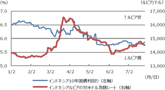新興国のなかで、特に注目が集まったのはインドネシアです。インドネシア中銀は、国債を流通市場からではなく、財務省から直接購入しています。このような手法は「財政ファイナンス」と呼ばれ、通貨の信認を損ない、放漫な財政運営につながるリスクを抱えます。ただ、市場ではコロナ対策に限定されるものと解釈され、インドネシアの長期金利やルピアの対米ドル為替レートは、今のところ落ち着いた動きとなっています(図表2)。