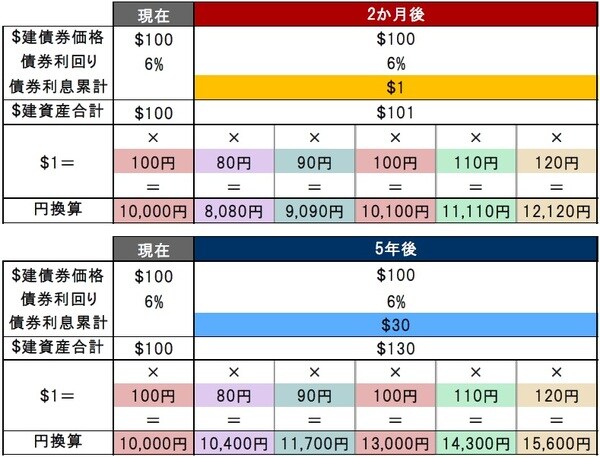 しかしながら、5年後にはインカムゲインの積み上げが大きくなり、為替レートが投資開始時点より20%円高になっていても、円換算のリターンは4%のプラスになっています。