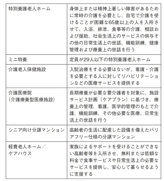 そこで、以下ではこの4つの施設の中身についてみていきましょう(その他の施設の概要については、[図表1]にまとめておきましたのでご参照ください)。