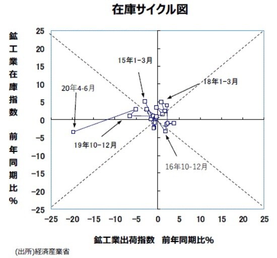 ●大きな動きをチェックするために、鉱工業全体で縦軸に在庫の前年比を、横軸に出荷の前年比をとった在庫サイクル図をつくると、17年10~12月期以降、45度線を上回って推移し、概ね「在庫積み上がり局面」が続いていた。19年10~12月期、出荷の前年同期比が▲6.5%、在庫が同+1.2%、20年1~3月期、出荷の前年同期比が▲5.2%、在庫が同+2.9%と、どちらも「在庫調整局面」であった。20年4~6月期は、出荷の前年同月比が▲19.8%、在庫が同▲3.4%と、出荷は大幅に減少したものの在庫調整がさらに進んだ。引き続き、「在庫調整局面」の状態にある。