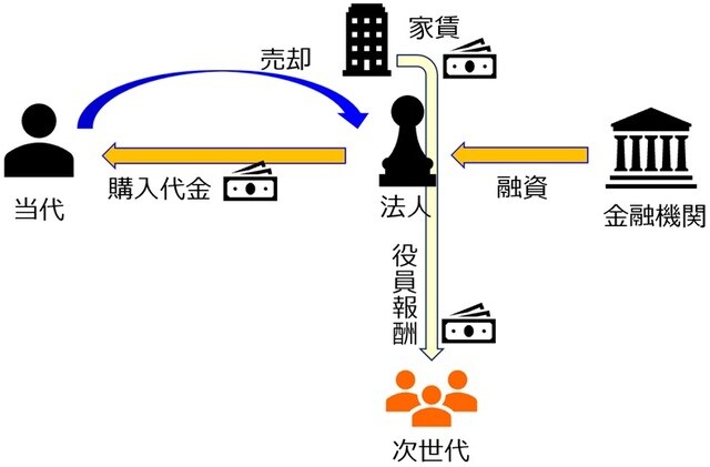 また、同じくマンションの高収益性が認められ、そのまま保有すると父の個人預金がどんどん増えていき、結果的に莫大な相続税を支払わなくてはならないとき、「所得の次世代への移転」という意味で、「次世代」を中心とする法人に名義を移転することも効果的です。次世代が出資した法人に、次世代が役員としてその名を連ね、役員報酬として収入を得ていきます。これはそのまま、相続税の納税資金となります。