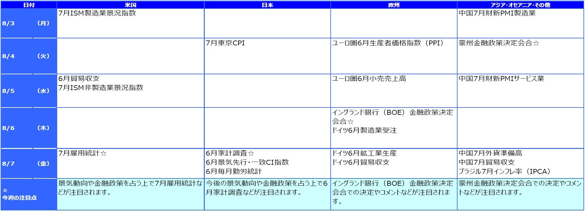主要株式市場はおおむね下落しました。米国株式市場は、米国がヒューストンの中国総領事館の閉鎖を命令し、中国政府も成都の米総領事館の閉鎖を前週に要請したことで、米中対立激化が懸念されたほか、新型コロナウイルスの感染拡大が続き経済活動正常化の遅れも懸念されました。一方で追加経済対策やワクチン開発への期待などは下支え要因となりました。NYダウは週間では0.16%下落しました。日本株式市場は、為替市場でドル安・円高が進行したことや、新型コロナウイルスの国内感染が全国的に広がったこと、4-6月期決算発表で主力株の一部が想定を下回ったことなどから日経平均株価は4.58%下落しました。欧州株式市場は、米国やドイツの軟調な経済指標や米中対立激化懸念などから下落しました。DAX指数は4.09%、FTSE100は3.69%下落しました。中国株式市場は、市場予想を上回る強い製造業PMIの発表などを受け、景気の先行きに対する懸念が後退し、上海総合指数は3.54%上昇しました。香港ハンセン指数は0.45%下落しました。
