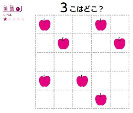 もんだいのりんごの数(かず)を「タテが3マス、ヨコが3マス」のわくでかこみましょう。