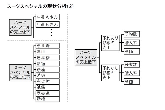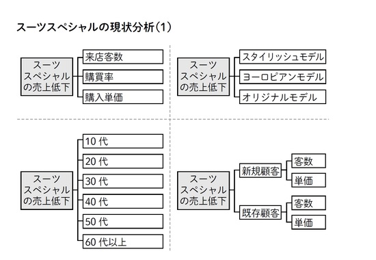 参考までに、スーツスペシャルの売上を分解するツリーもいくつか掲載しておきます[図表1][図表2]。このように切り口を作り、実際の売上データを調べてみる。データ分析結果は、ステップ2の冒頭でご紹介します。問題解決マップのステップ2に進んでいきましょう。