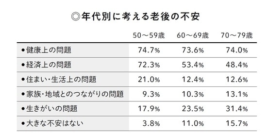 やはり、どの年代でも「健康上の問題」が全体の3/4程度を占(し)めています。「経済上の問題」に対する不安については、50〜59歳の定年前の年代層の72.3%が不安を持っていますが、実際に老年になった70〜79歳では50%を割り、減少傾向にあります。