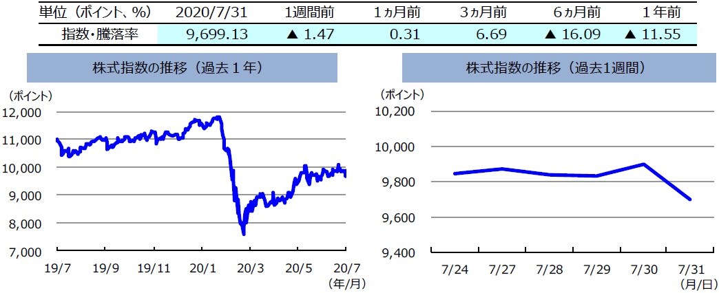先週の豪州株式は、下落して引けました。週の前半は、米国の景気対策期待などを背景に堅調に推移しました。その後は、米国2QGDP前期比年率が過去最大の落ち込みとなり、新型コロナ感染再拡大に対する懸念も続いていることなどから下落に転じ、週間では下落となりました。