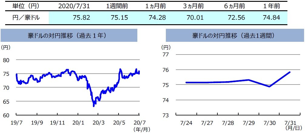 先週の豪ドルの対円レートは、上昇しました。週初は、米中対立に対する懸念が継続していましたが、豪ドルの対円レートはほぼ横ばいで推移しました。また、週半ばに公表された豪CPIの伸びの鈍化に対する反応も限定的なものに留まりました。週後半は日本における新型コロナ感染者再拡大を懸念した円売りの動きが見られたことから、週間で見ると豪ドルの対円レートは上昇しました。