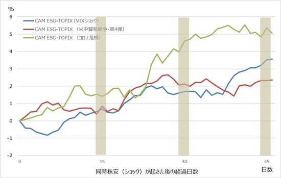 市場が危機下にある場合、投資家の安全資産への志向は強く、ポートフォリオ・ベースで分析することが望ましいと思います。この確認のため筆者が頻繁に利用する方法は「ESGポートフォリオ対市場指数の超過リターン」です。平常時で危機に備えるような財務体質を持つESGポートフォリオの構成銘柄には投資家の関心が集まります。市場指数の構成銘柄より下落率が少なく、超過リターンになることがわかります。