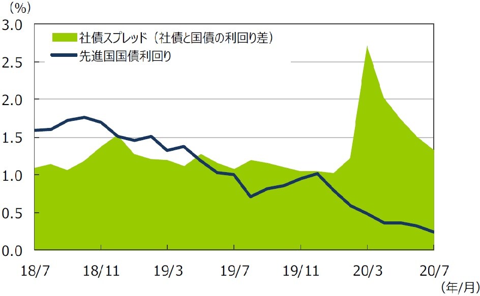 主要先進国の国債利回りは低下しました。世界経済の早期回復期待が徐々に後退したことに加え、先進国で新型コロナ感染再拡大の様相が強まったことや米中対立の深刻化に対する懸念などから国債が買われ利回りが低下しました。日本でも月後半、新型コロナ感染再拡大への警戒感が強まったため利回りは低下しました。一方、国債と社債の利回り格差は縮小しました。米連邦準備制度理事会(FRB)の社債購入を背景に、プラスの利回りを求める資金流入が続きました。