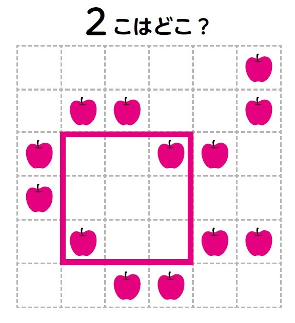 <ヒント>りんご2つだけを枠で囲む必要があります。左下の方を注意しましょう。 ※クリックでこたえを見る