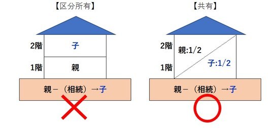 実は、1の区分所有の場合には税務上同居とみなされないため、同じ土地に住む子がその土地を相続しても小規模宅地等の特例は適用されません(図表1)。
