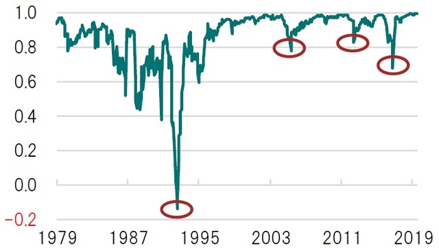 MSCI世界株指数における米国株の構成比率は今年7月末時点で66%だ。一見すると世界株では十分な分散効果が得られないようにも思われる。しかし、MSCI世界株指数と同米国株指数の相関係数の推移を見ると、直近こそ0.99と非常に高い相関を示すものの、相関係数は常に変化しており、過去必ずしも高い数値を示していたわけではなかった(図表3)。