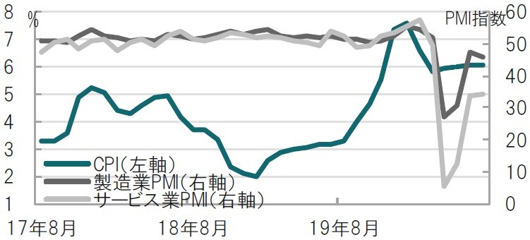 全国的な経済制限は緩和されましたが、足元一部地域で制限が強化されています。7月の製造業とサービス業購買担当者景気指数(PMI)は頭打ちです(図表2参照)。インド中銀の会見でもダス総裁はモビリティデータが鈍化していることを指摘していますが、確かに8月データを見ても回復は鈍いままで、感染再拡大の影響がうかがえます。
