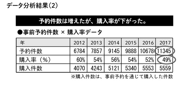 このデータを見ると、予約件数は増えていますが、購入率が下がっていることが発見できました。ちなみに、この購入件数は、事前予約を通じて購入した件数となるため、予約なしで購入した件数は入っていません。