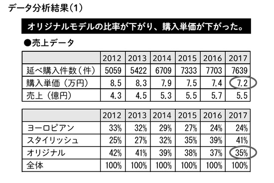 データ分析結果(1)は、売上データです。延べ購入件数×購入単価×売上のデータを見ると、延べ購入件数は増えているものの、購入単価は下がっていることが発見できます。また、モデル別の売上比率を見てみると、オリジナルモデルの比率が下がってきています。つまり、オリジナルの比率が下がり、購入単価が下がったことがわかります。